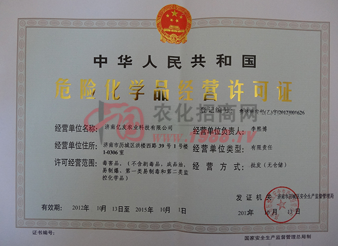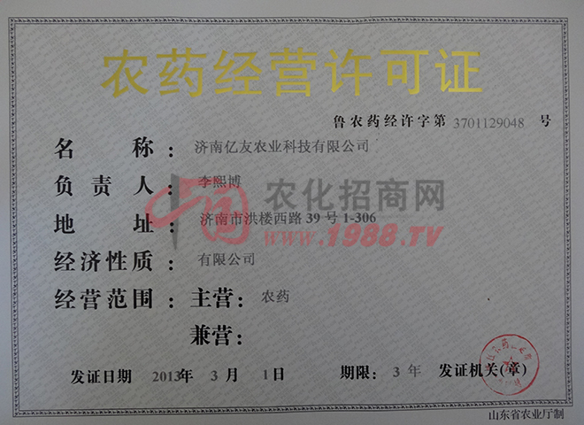濟(jì)南億友農(nóng)業(yè)科技有限公司成立于2006年12月6日,公司前身是山東大學(xué)科貝爾生物工程有限公司(濟(jì)南金科生化有限公司)的研發(fā)中心,2009年經(jīng)過(guò)重組改成了股份制公司。公司現(xiàn)擁有資深農(nóng)業(yè)專家2名,農(nóng)藥化工高級(jí)工程師、化學(xué)博士指導(dǎo)數(shù)名,研究生數(shù)名,技術(shù)力量雄厚。公司目前主推佳圣®牌、億友嘉田®牌,科巧®套餐系列30%毒死蜱微膠囊懸浮劑花生、土豆、大蒜拌種劑系列,以及蘇寬®,百凈®,全奪®(8000iu/ul蘇云金桿菌懸浮劑)全能殺蟲(chóng)劑系列,其具有性高、持效期長(zhǎng)、殺蟲(chóng)譜廣等特點(diǎn),公司近還推出了蘇線丹®等高效低毒殺蟲(chóng)、殺線蟲(chóng)劑等產(chǎn)品,好產(chǎn)品不斷推出中,公司法人李熙博竭誠(chéng)歡迎您的到來(lái)。